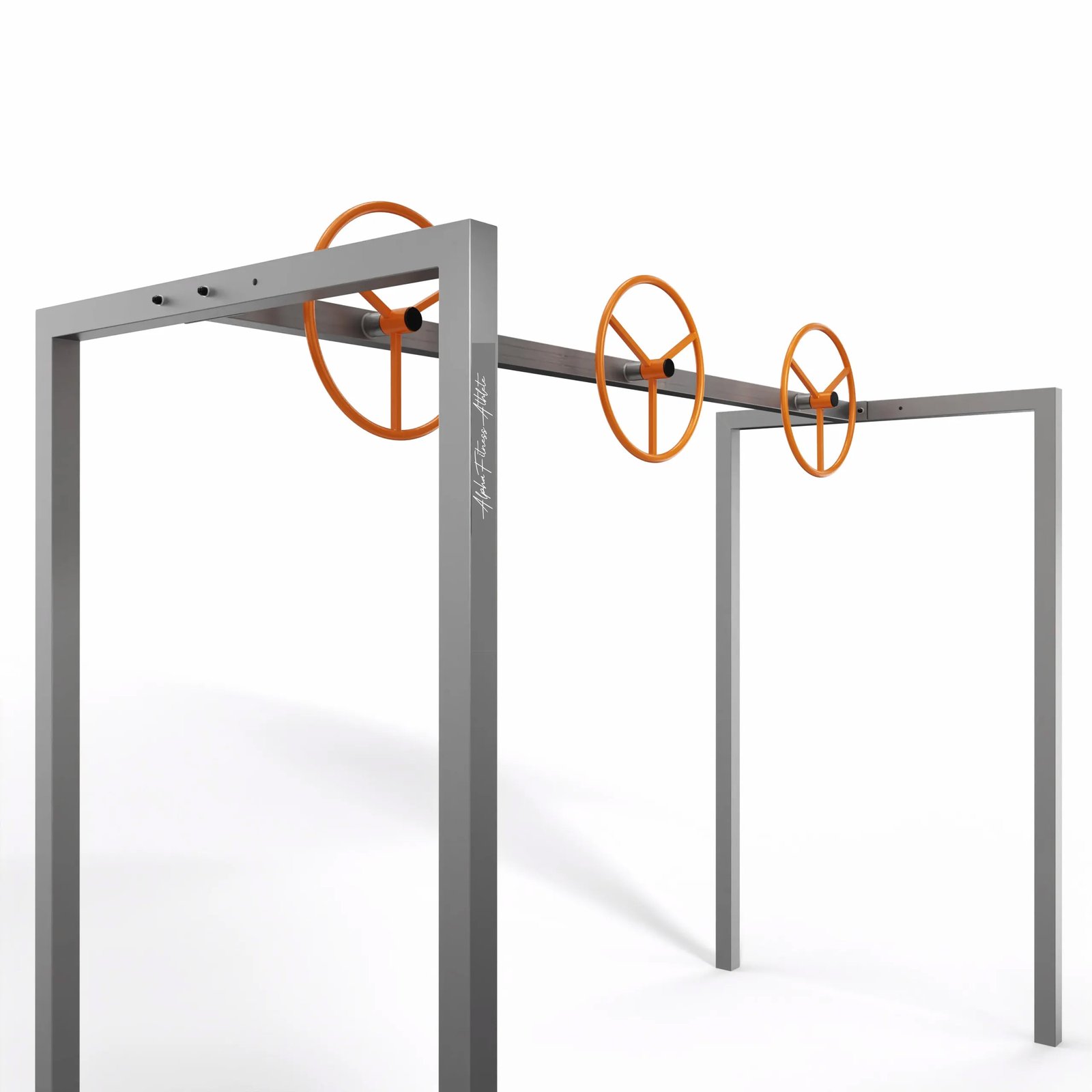 Built for outdoor durability, the rig is coated with high-grade, weather-resistant materials. Whether you’re training for a Spartan race or installing a fitness station in a park or gym, this wheel-based obstacle rig is engineered for performance and longevity.
